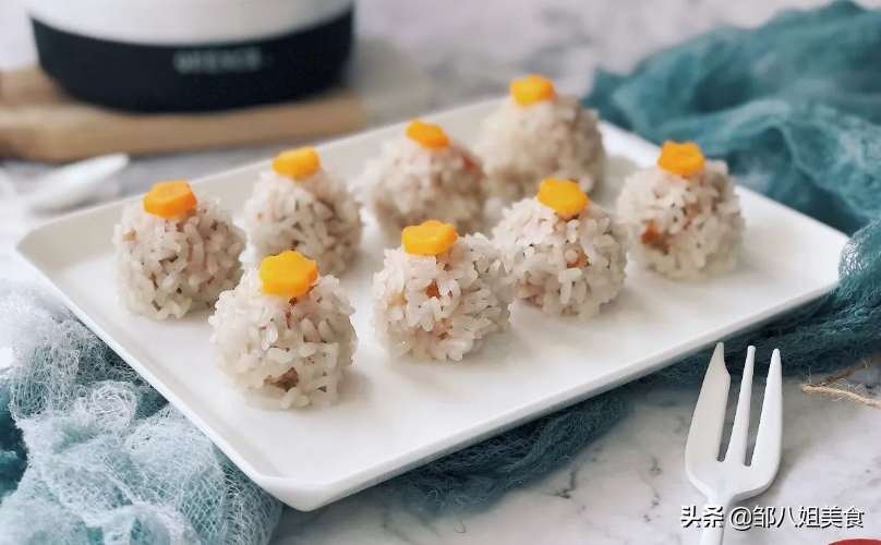 糯米丸子放進盤內,擺上少許胡蘿蔔點綴,處理好後放進蒸鍋,開大火蒸二十分鐘左右,蒸好就可以上桌吃了。