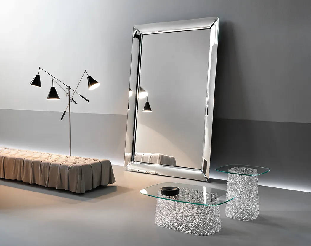 曲面玻璃鏡,款式可選落地鏡和上牆鏡,搭配單一四片式 6 mm 背面鍍銀弧面玻璃框架。