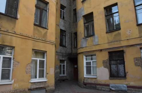 與當地朋友一道,我按圖索驥地找到這棟外表十分普通,甚至顯得破舊的黃色6層樓房。與景象繁華的城市歷史中心區相比,附近街道狹小、凌亂。從位置看,這裡鄰著先納亞區,先納亞因曾經廢棄的乾草市場得名,是陀思妥耶夫斯基筆下聖彼得堡的中心。那時的先納亞是這座城市的髒亂之所,初來城市的窮苦工人和農民彙集於此。