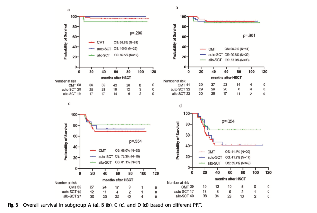 研究者為了探索透過多引數流式細胞儀(MFC)動態監測的MRD、緩解後治療方案選擇和低危AML臨床結局之間的關聯,根據MRD1、MRD2和MRD3的動態變化進行了亞組分析。患者分為四個亞組:(I)亞組A,1個療程化療後達到MRD-(MRD1-/MRD2-/MRD3-);(II)亞組B,2個療程化療後達到MRD-(MRD1+/MRD2-/MRD3−);(III)亞組C,3個療程化療後達到MRD-(MRD1+/MRD2+/MRD3−);(IV)亞組D,3療程化療後持續MRD+(MRD1+/MRD2+/MRD3+)或MRD復陽(從MRD-到MRD+)。在亞組A和亞組B中,CMT組、auto-HSCT組和allo-HSCT組患者的OS無統計學差異(p值分別為p=0.340和p=0.627)。但在兩個亞組中,CMT和auto-HSCT組患者的GRFS均優於allo-HSCT。在亞組C中,allo-HSCT組的DFS率優於CMT組(p=0.009)。在亞組A、B、C中,緩解後治療方案的選擇對OS並未有顯著影響。但在亞組D中,allo-HSCT組的OS優於CMT組和auto-HSCT組(p值分別為p=0.011和p=0.029)。具體如圖3。