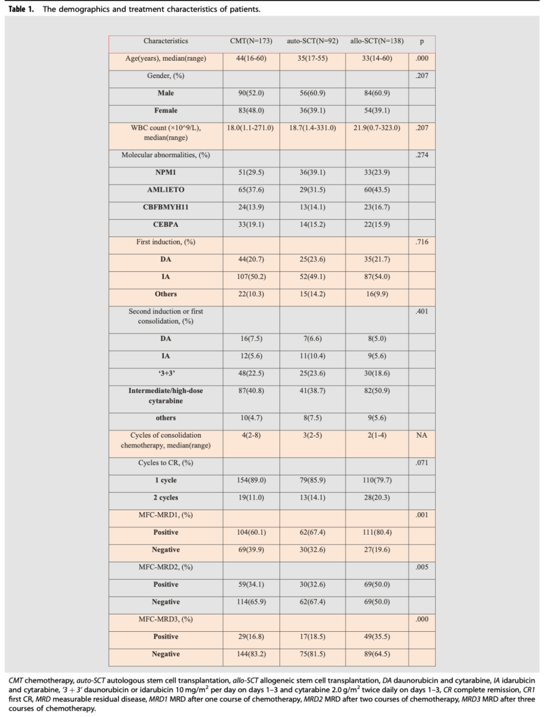 該研究共納入403例患者,CMT組173例,auto-HSCT組92例,allo-HSCT組138例。該研究中,MRD是原因變數,因此為確保MRD資料完整性,排除了在3個化療療程內77例MRD資料缺失的患者。在這77例患者中,CMT組40例(18.8%),auto-HSCT組14例(13.2%)以及allo-HSCT組23例(14.3%)(p=0.335),資料缺失率在三組之間無統計學差異。在allo-HSCT組,61例患者接受了匹配同胞供者(MSD)移植,77例接受了替代供者移植,在後者中,64例為單倍體供者(HID)移植,10例為匹配無關供者(MUD)移植以及3例為臍帶血移植。入組患者的中位年齡為36(14-60)歲,CMT組中位年齡為44(16-60)歲,auto-HSCT組為35(17-55)歲,allo-HSCT組33(14-60)歲。CMT組患者的年齡高於auto-HSCT和allo-HSCT組的患者,有統計學意義(p值分別為p=0.002和p<0.001)。與CMT組相比,在allo-HSCT組中,需要兩個週期才能達到CR的患者比例更高(p=0.026)。在allo-HSCT組中,第一次化療後MRD+(MRD1+)、第二次化療後MRD+(MRD2+)以及第三次化療後MRD+(MRD3+)的患者更多(p=0.001、p=0.006、p<0.001)。三組患者基本特徵具體如圖1。