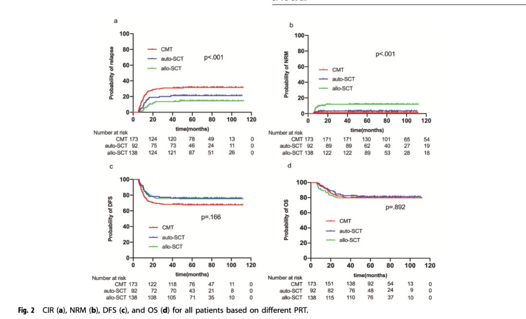 入組患者CR1至復發的中位時間為10.4(5.2-50.7)個月,CMT組為9.7(5.2-50.7)個月,auto-HSCT組為11.0(6.1-38.2)個月,allo-HSCT組為14.0(5.8-47.2)個月(p=0.018)。與CMT組相比,allo-HSCT組CR1至復發的時間更長,差異有統計學意義(p=0.006),但allo-HSCT與auto-HSCT(p=0.181)或auto-HSCT與CMT組(p=0.191)之間無統計學差異。CMT組的5年CIR為31.3%(95%CI,24.5-38.3%),auto-HSCT組為20.6%(95%CI,13.1-29.5%),allo-HSCT組為13.1%(95%CI,8.1-19.3%)(p<0.001)(圖2a)。多變數分析表明,allo-HSCT組的CIR顯著低於CMT組(HR,0.176[95%CI,0.096–0.324];p<0.001)和auto-HSCT組(HR,0.330[95%CI,0.170–0.639];p=0.001),且auto-HSCT組的CIR也低於CMT組(HR,0.535[95%CI,0.320–0.893];p=0.017)。5年累積NRM在CMT、auto-HSCT和allo-HSCT組分別為1.2%(95%CI,0.2-3.8%)、3.3%(95%CI,0.9-8.5%)和11.6%(95%CI,6.9-17.6%)(p<0.001)(圖2b)。allo-HSCT組的NRM顯著高於CMT組(HR,10.605[95%CI,2.449–45.923];p=0.002)和auto-HSCT組(HR,3.710[95%CI,1.080–12.744];p=0.037),但auto-HSCT和CMT組之間無統計學差異(HR,2.858[95%CI,0.478–17.090];p=0.250)(圖2b)。