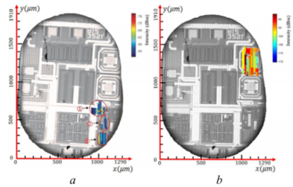 圖4.a、某器件傳送電路定位結果,b、某器件接收電路定位結果