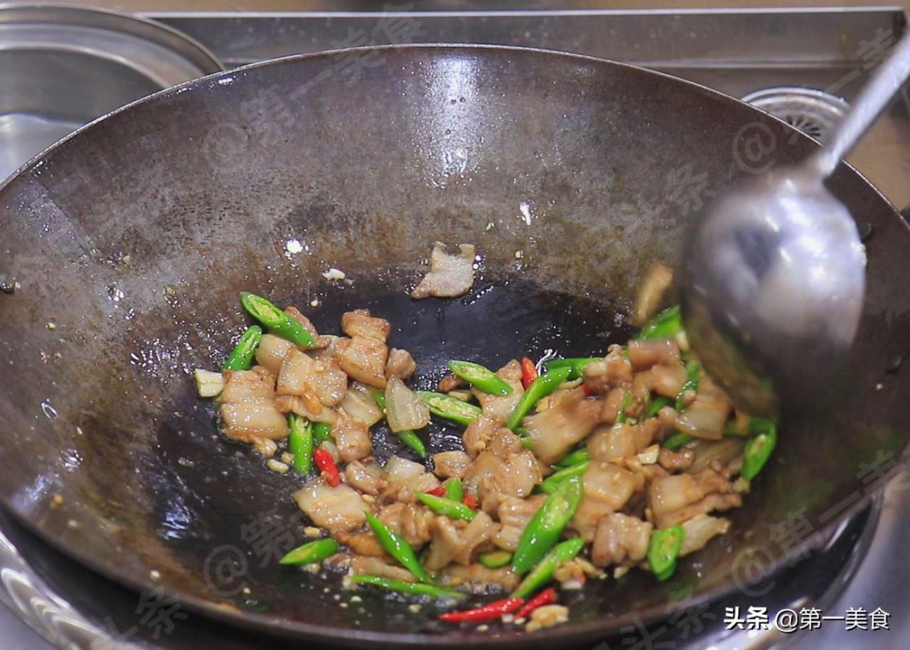 2.鍋內燒油,充分滑鍋以後 ,把肉片放入鍋中煸炒2分鐘,把肉片裡的肥油煸出來,肉片呈透明狀,聞到肉香味了。