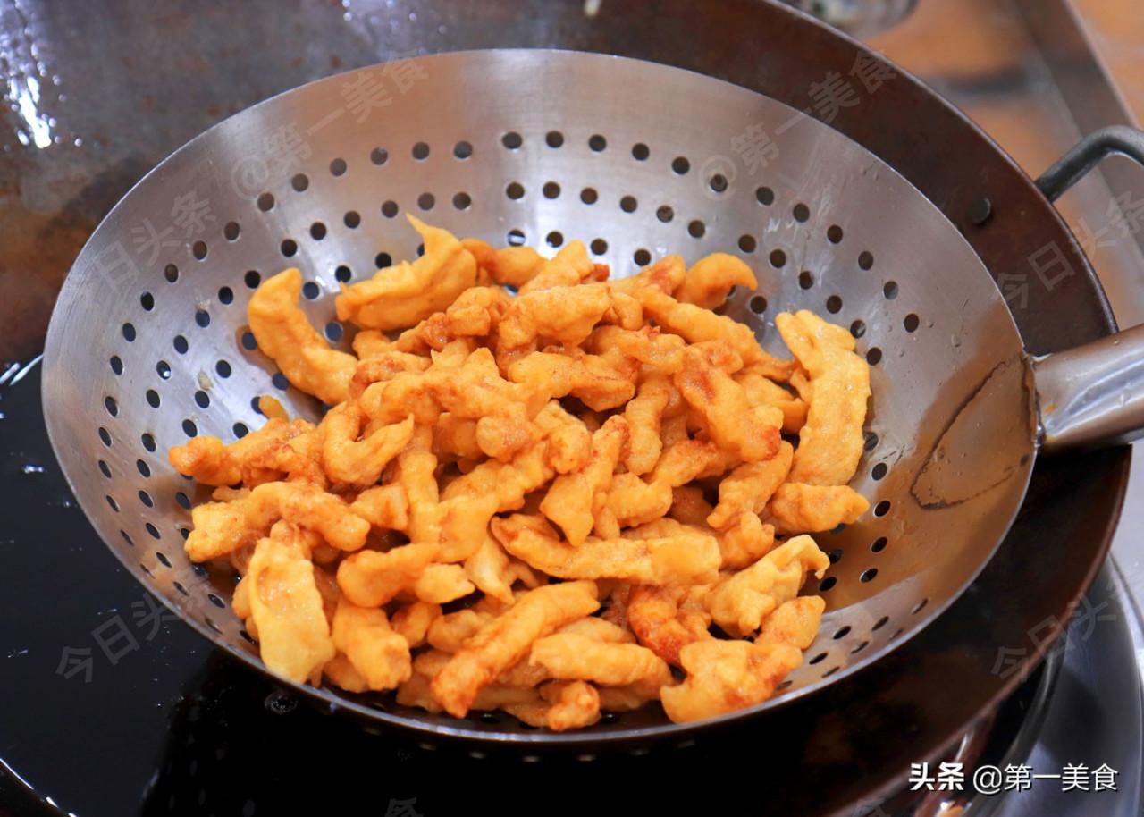 鍋內燒油,油溫燒至5成熱,把肉條撒開放入鍋中,用小火慢炸,肉條炸成金黃色、全部漂浮在油麵上時 ,撈出來控油。