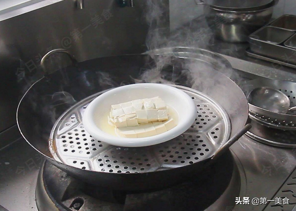 2.把豆腐蒸一下,大火把水燒開,開中火蒸8分鐘,豆腐煮熟取出。把蒸豆腐時盤子裡的水倒出來。