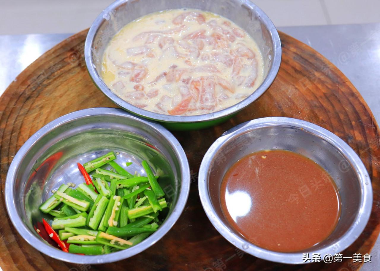 1.準備一塊裡脊肉,先切成厚片,再切成1釐米寬的肉條,切好以後,放入清水中洗乾淨,然後擠幹水分醃一下。