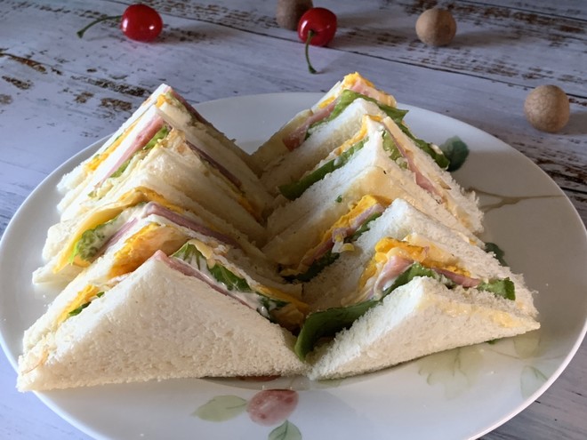 - 依次放上生菜、芝士片、火腿片,蛋黃醬根據自己喜好控制多少,各種食材順序也可以隨意,最後蓋上切好的另一片吐司麵包片,是一個大大的正方形噢。火腿片也可以用煎培根代替,同樣好吃。