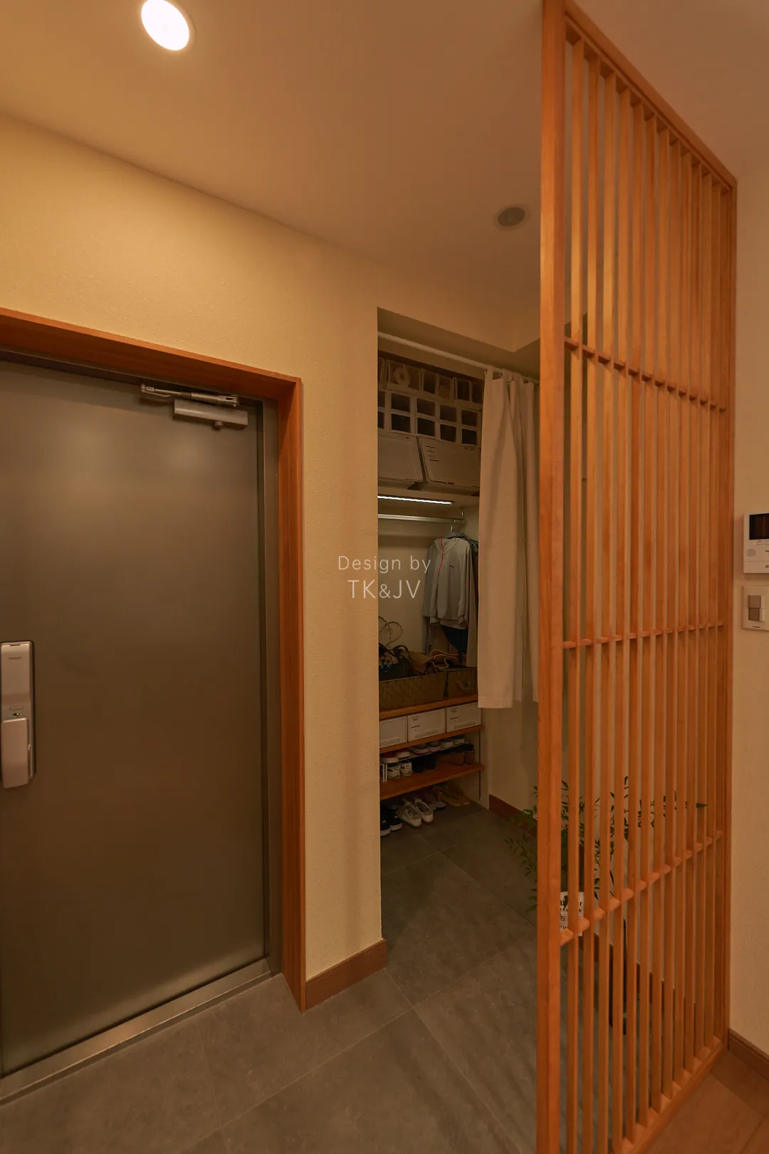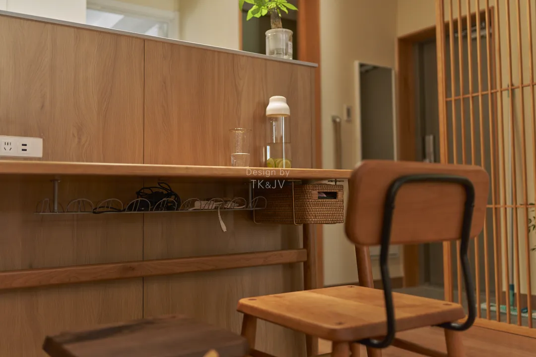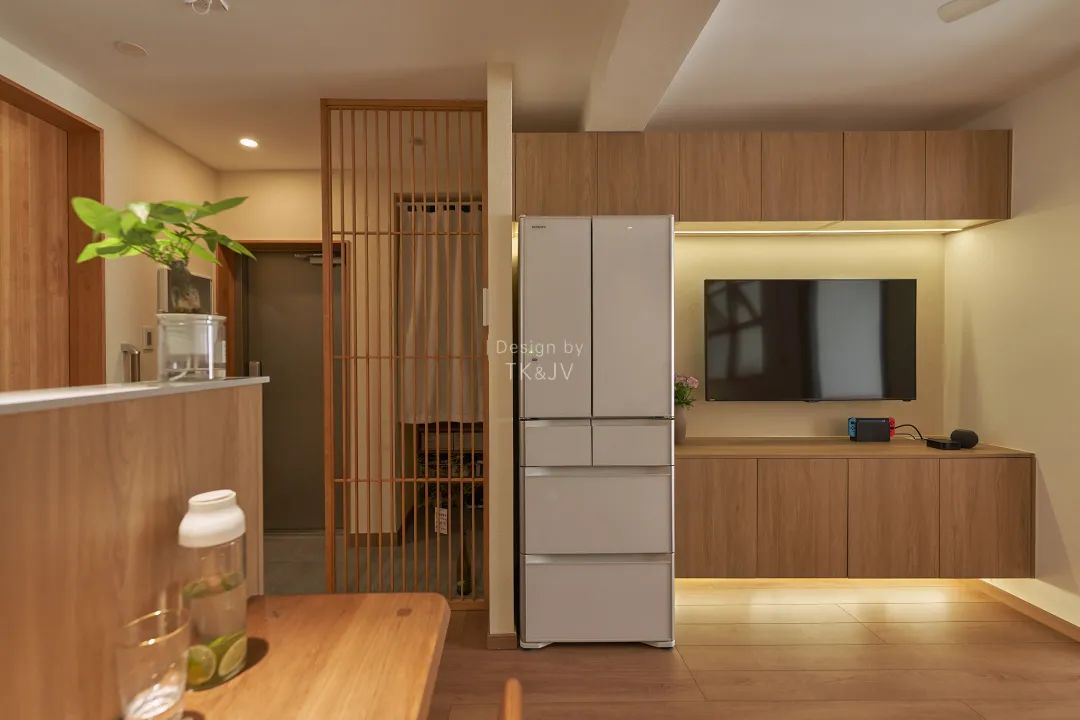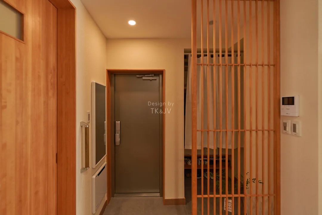 土間和室內使用日式氣氛組——木格柵,作為半開放式隔斷,既在視覺上區分了兩個區域,也增加了整體的通透性和層次感。