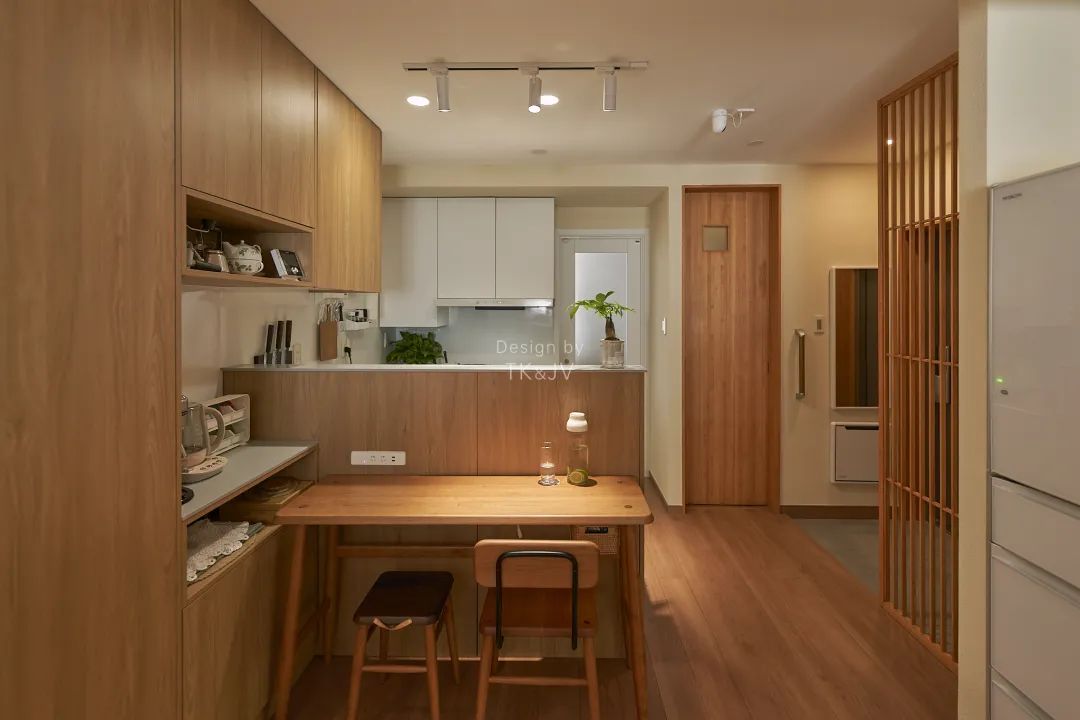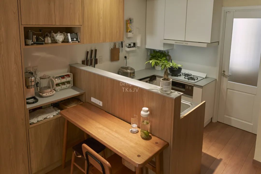 平日都是一人食,所以餐桌不需要很大,但是又想要保留就餐的儀式感,所以設計成居酒屋吧檯桌的形式,緊靠島臺,最大程度節省了空間。