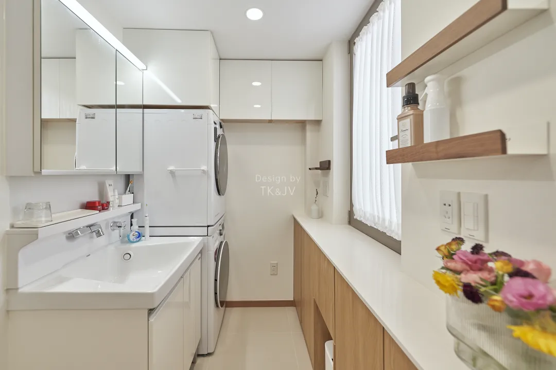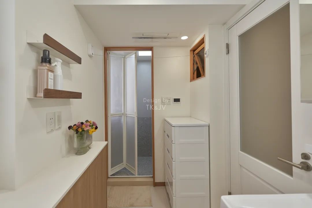 衛生間的空間經過拓展,增加了洗衣的空間。沿著窗臺設計了一排窄窄的邊櫃,收納小物的能力不在話下。同時它也能作為家務操作檯,把烘乾的衣物取出後,轉身即可放在上面做摺疊整理。櫃子下方,留空出來嵌入小垃圾桶,這樣視覺上也能幹乾淨淨。