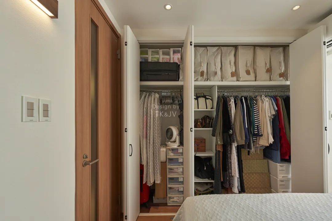 日本的收納間的標準做法,內部留空只做一層置物層板,從材料到價格都是“輕”配置。衣物掛起存放,很方便尋找和拿取,上方使用收納袋存放過季物品,空餘區域根據自己的需要來配置其他櫃子或抽屜,達到最合理的利用。外面的摺疊門可以最大幅度的開啟,一目瞭然的感覺,方便你盡情地做收納~