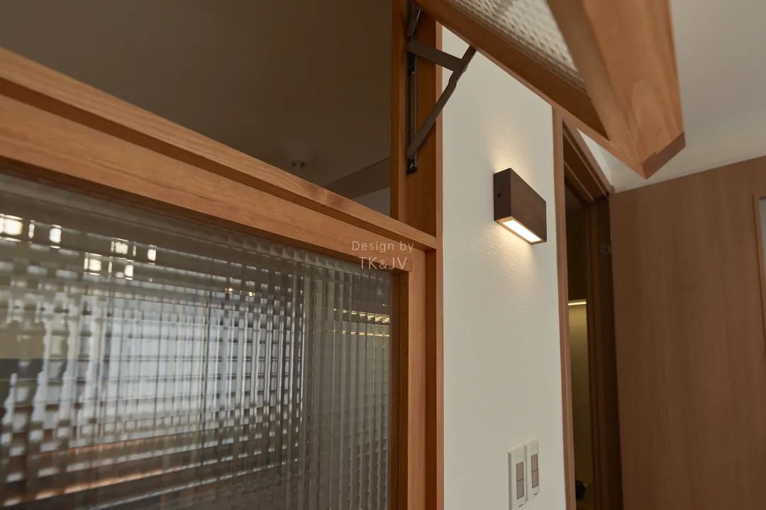 中間的暗廳是“條頭糕"戶型無法避免的問題,南北的採光無法進入房屋中心。所以我們增加了帶採光玻璃的門和採光窗,來儘量補足一些光線。由於客廳平時也是晚上使用居多,所以適當地做些間接照明,讓視聽的氛圍感更好。