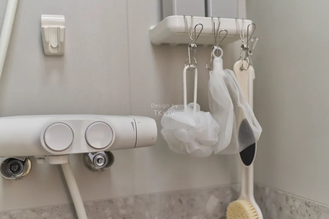 浴室裡的收納以牆面為主,顏色上和浴室的五金儘量保持統一,和諧就會好看。
