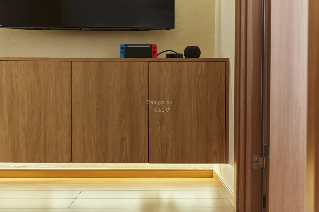 定製的客廳電視櫃,下方懸空,加了燈帶作為夜晚看電視的輔助照明。懸浮的設計可以有輕盈的效果,減少木質櫃的笨重之感。