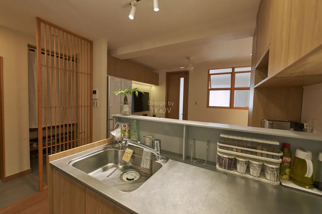 所以本案的LDK設計,是將一半的廚房空間出讓給了洗漱幹區,而剩下的一半開啟後與餐廳和客廳相連線,形成開放型的空間關係。