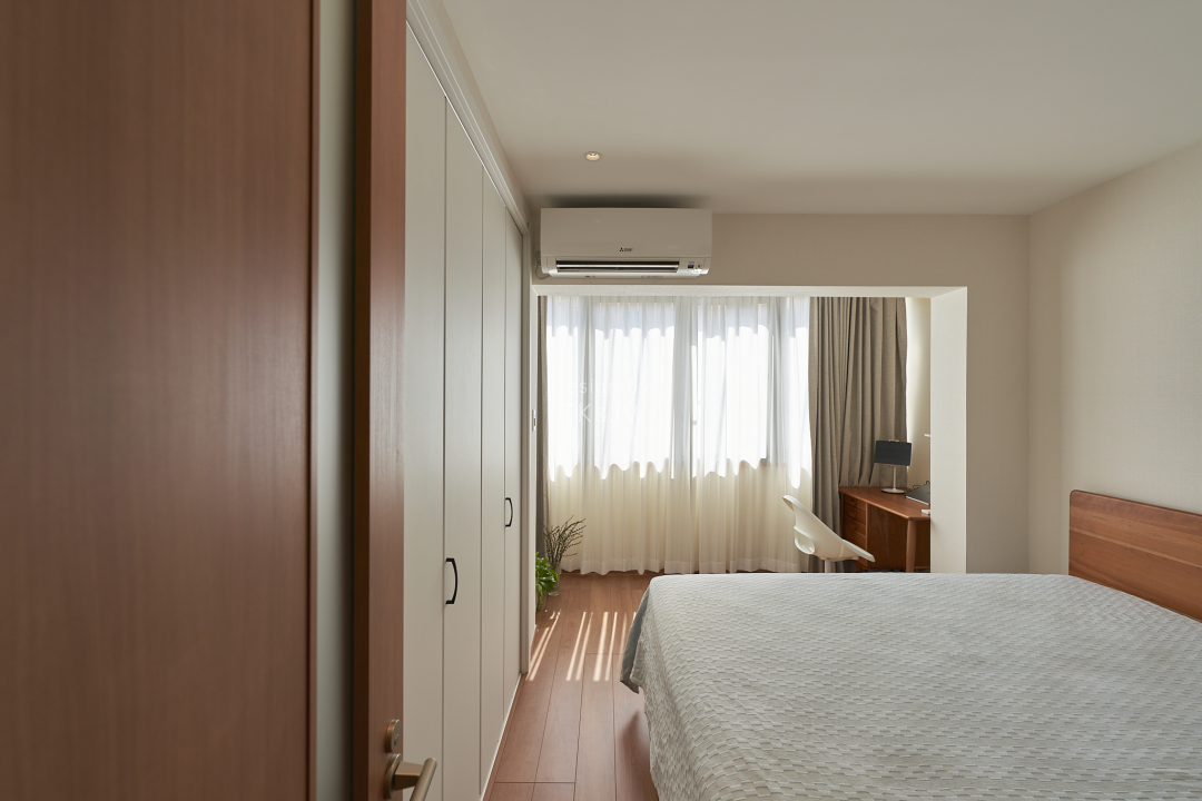 家裡唯一一臺壁掛式空調的位置和功率也是經過計算考量的,冷氣可以穿過開啟的臥室門,送達LDK甚至洗漱區內,實現全空間製冷!這個位置同時也避免直吹到床,可以安心睡個好覺。
