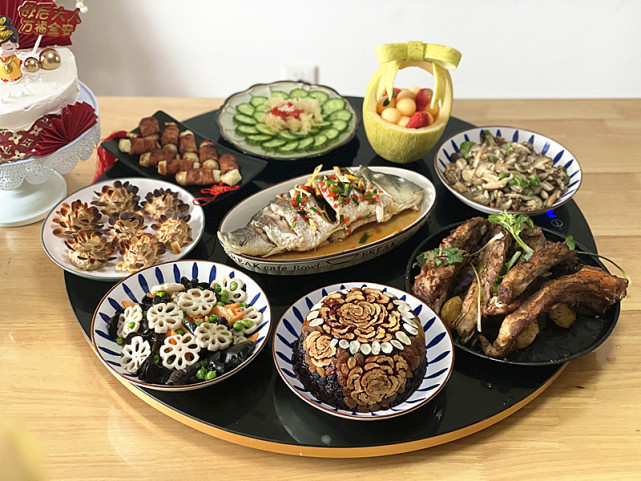 黃瓜和銀耳拌白糖,清爽開胃解油膩,最是受歡迎了,土豆泥裹上培根做成的爆竹聲聲,好看好吃又吉祥喲!荷塘月色最是受小朋友歡迎了,尤其是花朵狀的藕片,哄得小朋友多吃了一碗飯呢!空氣炸鍋炸的排骨,真的跟外面買的烤排骨一個味道,一人一根捧著吃,大口吃肉的感覺太棒了!清炒香菇片是表姐做的,香菇切得薄薄的,炒出來柔軟又入味,是我吃過的最好吃的香菇啦!這個做法真的一級棒!清蒸鯉魚,簡單又好吃,就是做的時候我把尾巴給剁掉了,有點不好看哈哈。