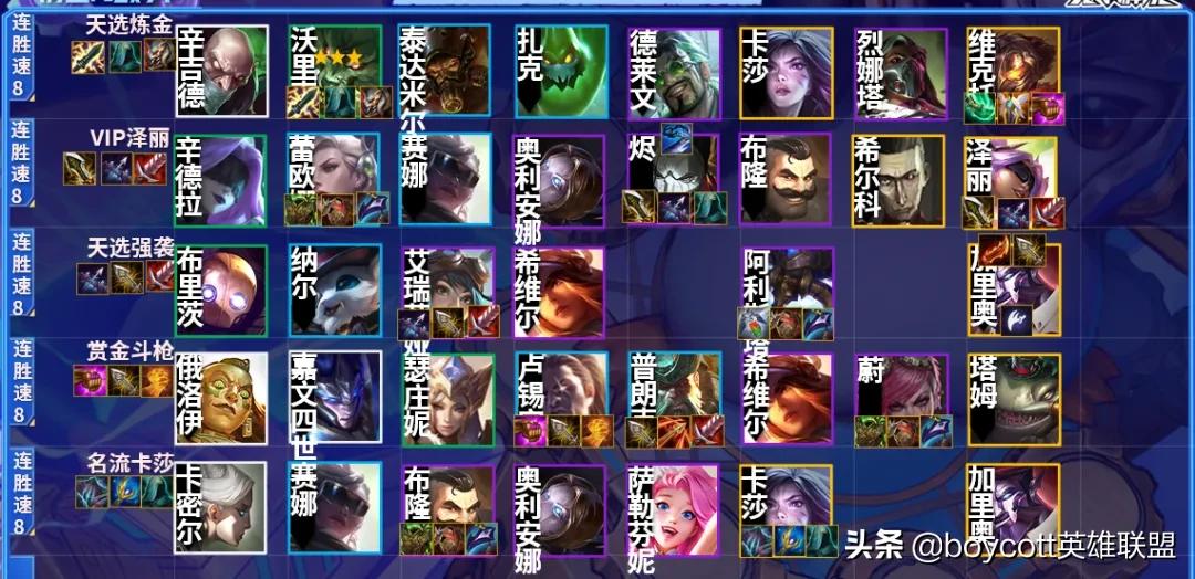 因為最新雲頂之弈新增了非常多的海克斯科技,所以能玩的陣容較多,這裡推薦一套無腦上分陣容其它陣容如圖所示