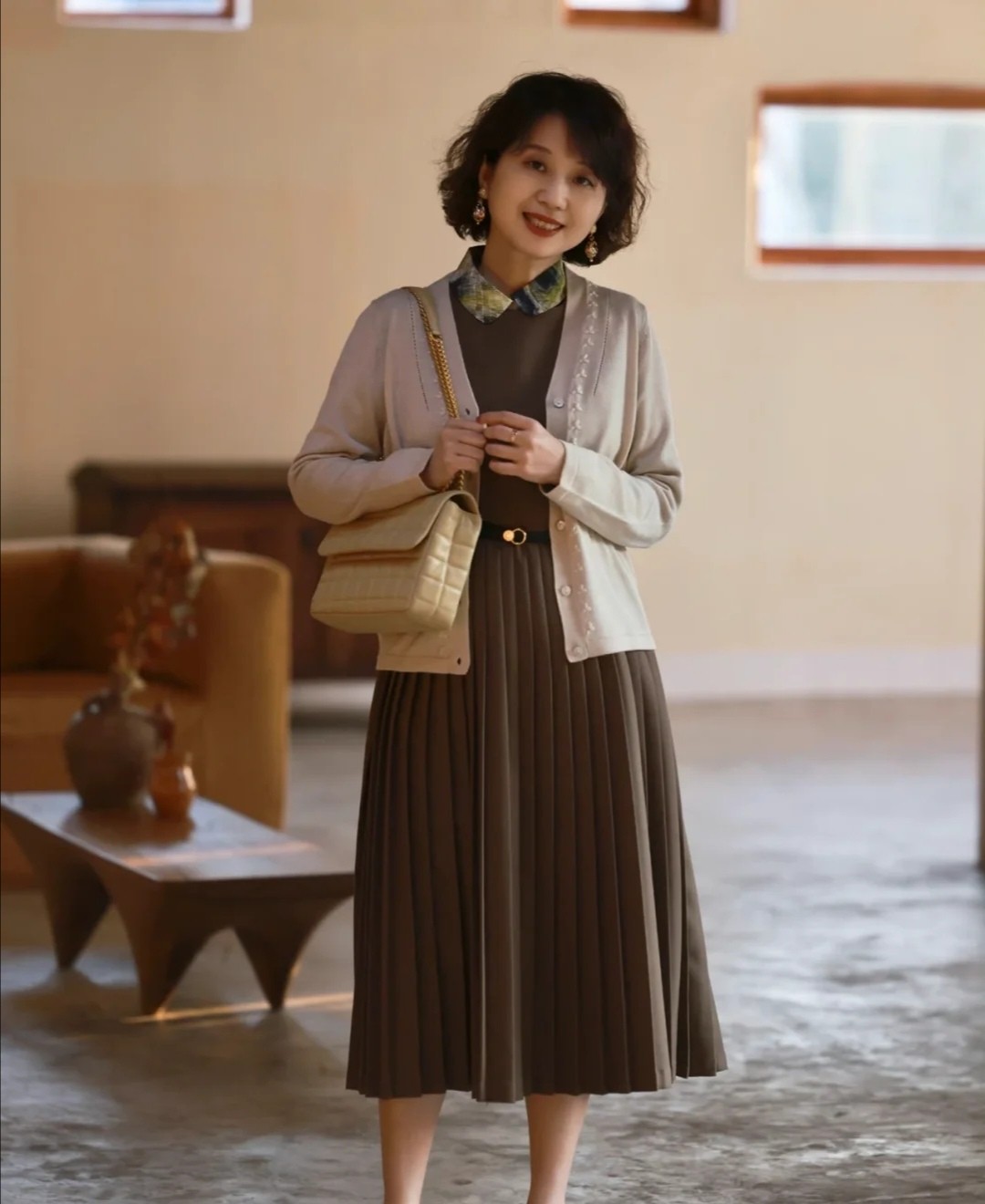 當百褶半身裙的顏色很百搭時,就可以配合各種樣式的上衣。對於四五十歲的女性來說,她們的著裝不需要過分的豔麗,造型保持基礎簡約的特點,就能讓形象變得更加得體。