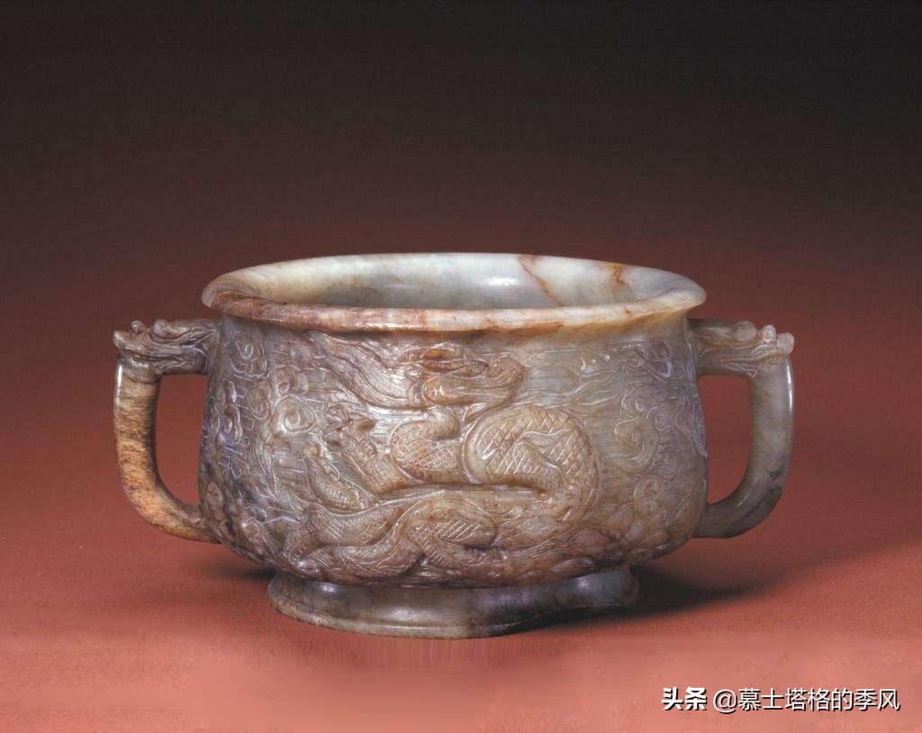 青玉雲龍紋爐,故宮博物院鎮館之寶,國寶級文物,宋代玉器,爐高7.9cm,口徑12.8cm,爐底印著乾隆的題詩,這是乾隆最喜歡的一件玉器,也是中國玉器的巔峰之作。
