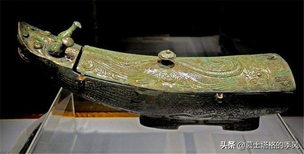 龍形觥,商代晚期青銅器,1959年出土,高19釐米,長43釐米,寬13.4釐米,器形獨特,紋飾奇絕,整體如一艘停泊在水波里的龍舟,山西青銅博物館鎮館之寶。