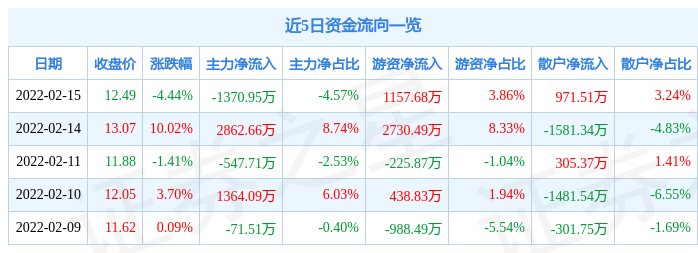 資金流向資料方面,上個交易日主力資金淨流出1370.95萬元,遊資資金淨流入1157.68萬元,散戶資金淨流入971.51萬元。近5日資金流向一覽見下表: