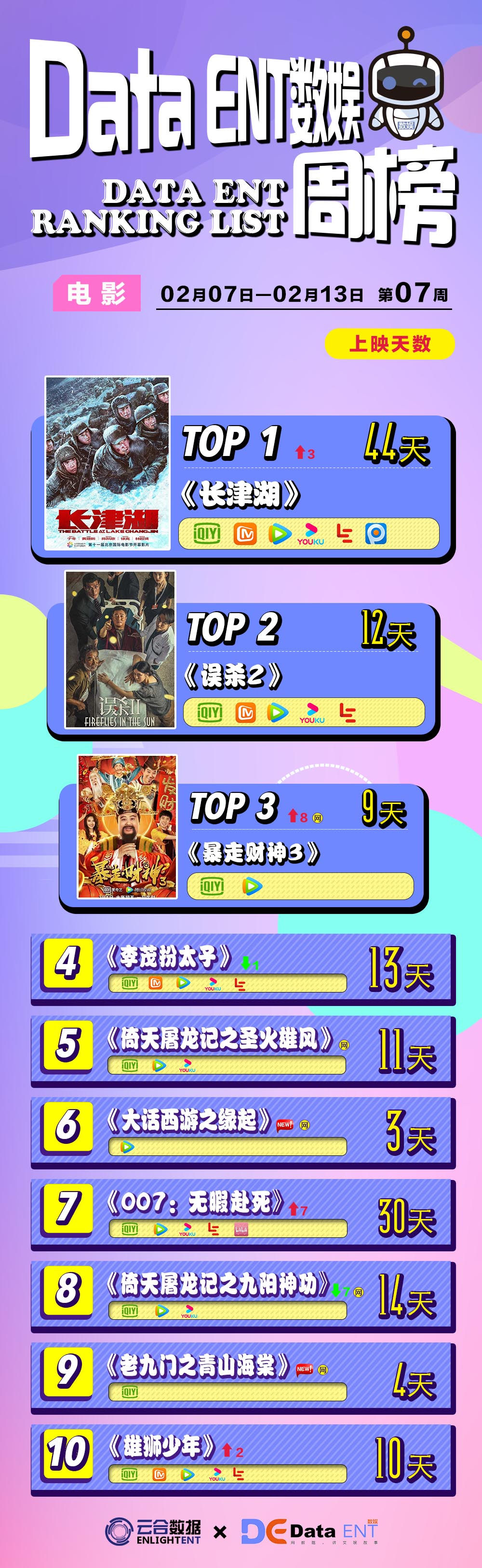 【Data ENT數娛】聯合雲合數據出品每週榜單。內容涵蓋每週電視劇、網路劇、臺綜、網綜、電影、網路電影、劇集熱度資料。
