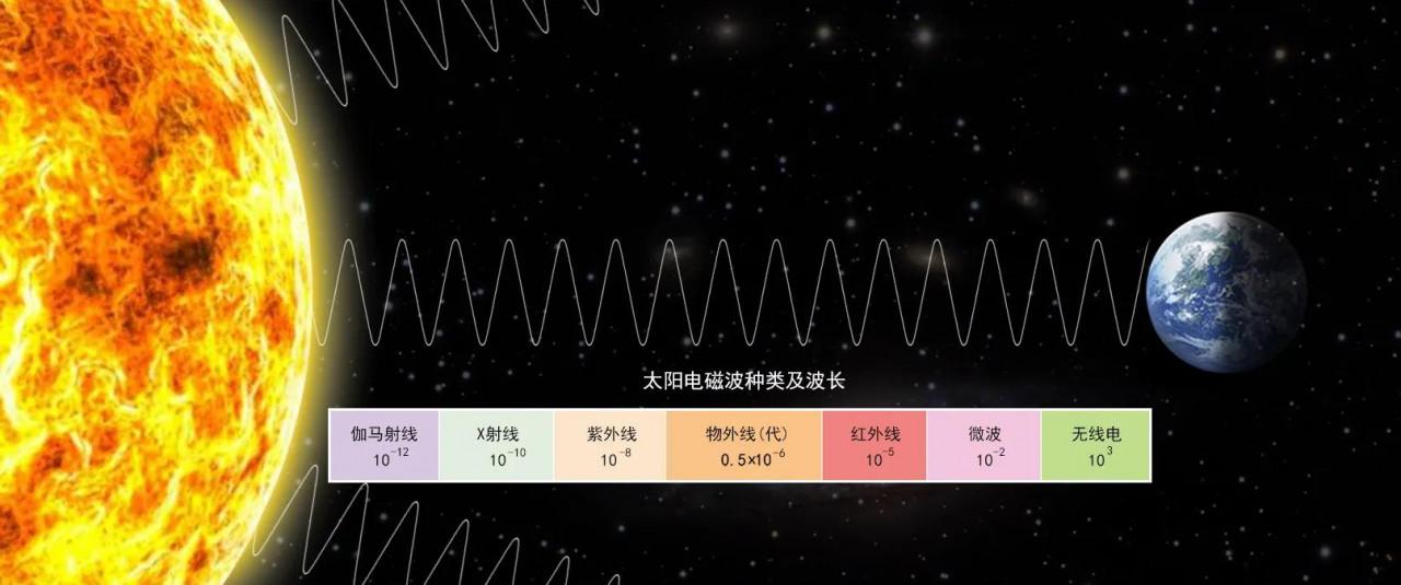 太陽能量就是透過太陽電磁輻射波以振動場的方式向太陽系內傳遞能量。可以認為太陽是由很多互不相干的點波源組成的擴充套件波源,從而,太陽輻射波具有非常寬的頻域,其振幅和相位都存在著快速的隨機漲落。在太陽總輻射中,根據其輻射波的頻率與波長,被劃分為不同種類的輻射線,且具有不同的功能。