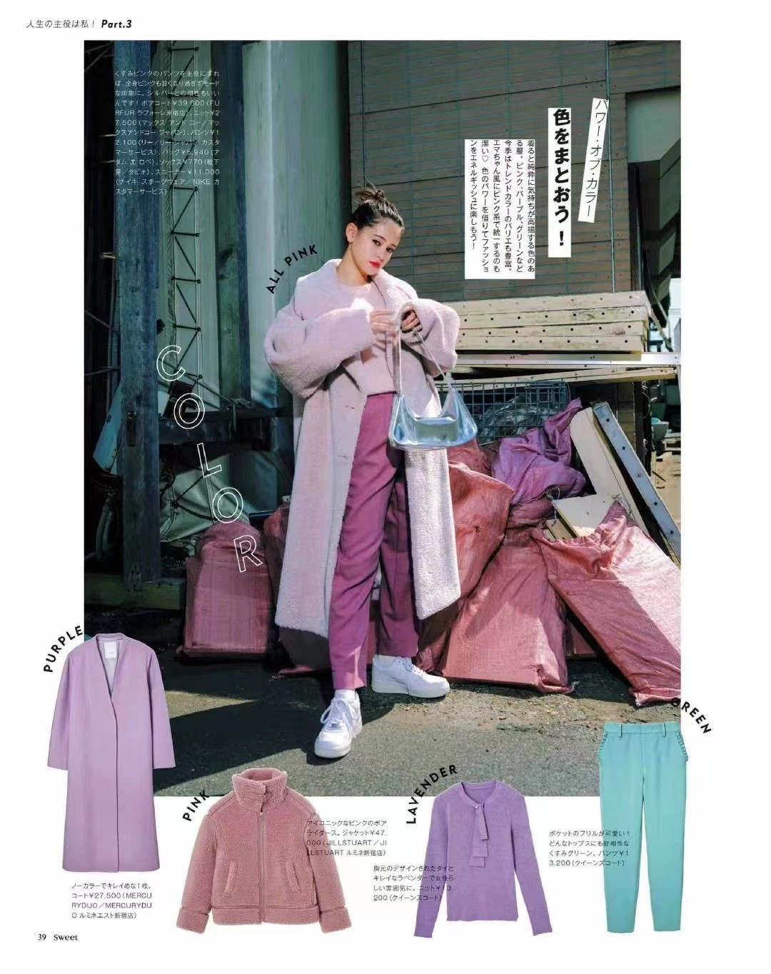 淡淡的紫色系和梅子色結合在一起也是非常出眾的,有一種鄰家女孩的效果,這一身的搭配也是沒有年齡限制的。