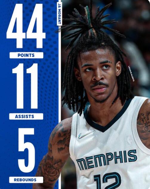 賈-莫蘭特20投11中,25罰21中得到44分11次助攻。