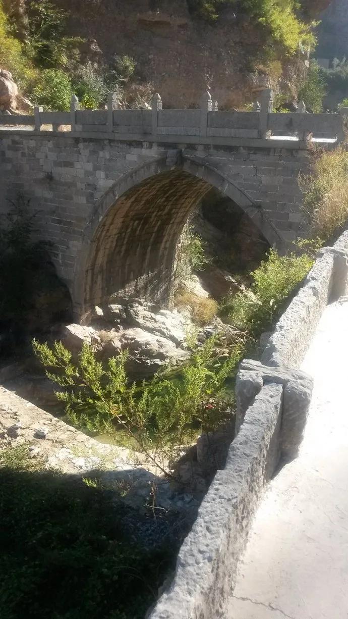 踏著古道,在兩個關隘之間,河谷之上,建有一座青石拱橋,名為“棧道橋”。如果沒有此橋,跨越河谷,難於上青天。它的簡介牌上寫著:《壺關縣誌》記載:“棧道橋在縣南河交口(今大河村),地為晉豫孔道,……”迄今已200餘年。