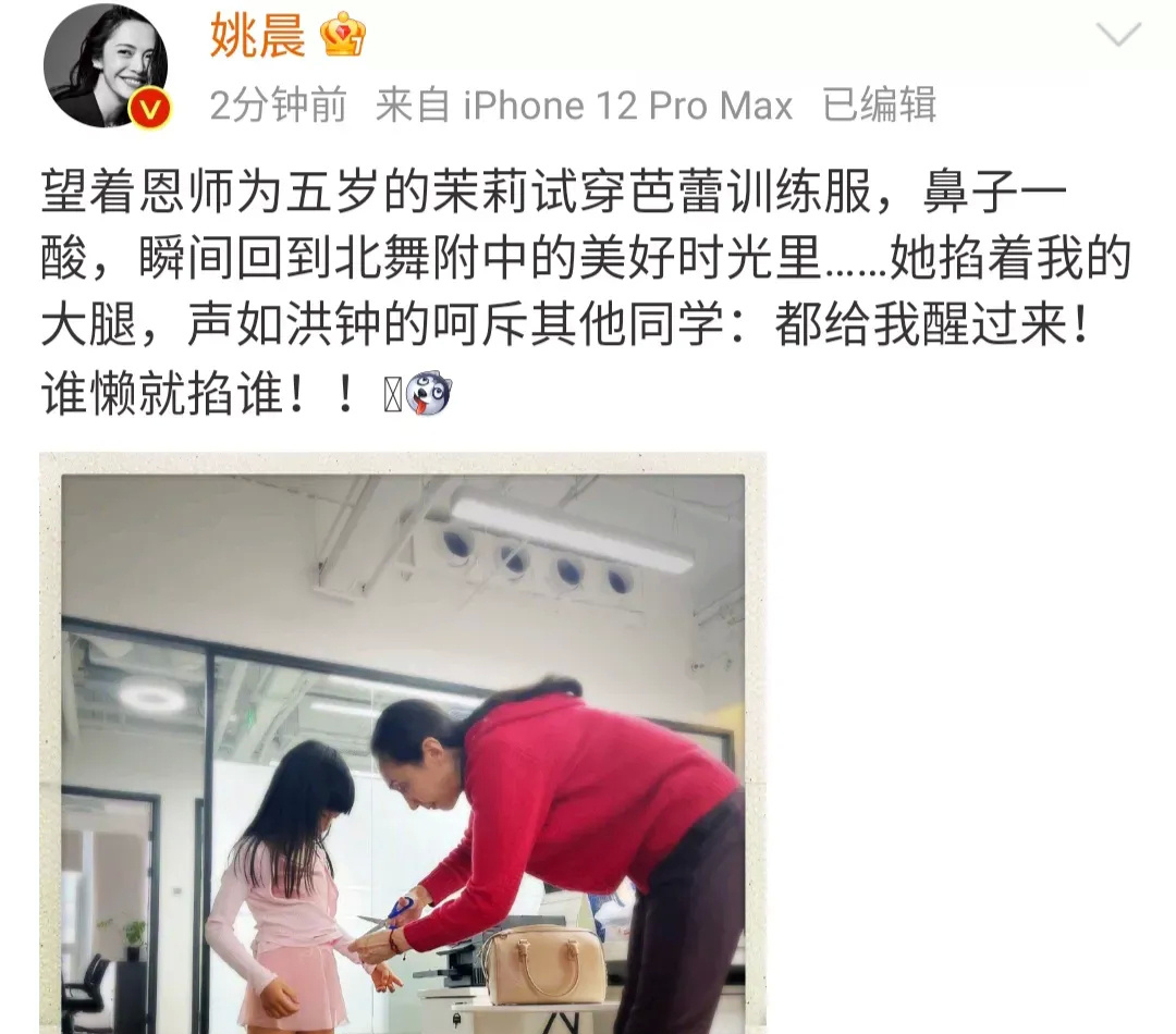 姚晨在配文中表示,看著恩師為女兒試穿芭蕾訓練服,讓她想到了自己在北京舞蹈學院附中的那些美好時光。
