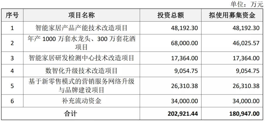 此外,箭牌家居還計劃募資18.09億元投建5個大型生產專案,分別為智慧家居產品產能技術改造專案、年產1000萬套水龍頭及300萬套花灑專案、智慧家居研發檢測中心技術改造專案、數智化升級技術改造專案、基於新零售模式的營銷服務網路升級與品牌建設專案。