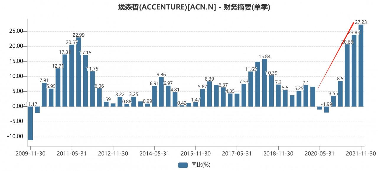 ① 做IT諮詢的埃森哲及加特納,業績都出現了加速的趨勢,其業績加速背後主要體現的就是大企業經歷疫情,都意識到了轉雲的重要性,包括以前不考慮轉雲的企業也加入到了轉雲的程序中,使得IT諮詢的收入快速上升,埃森哲在財報電話會議中表明,企業上雲是公司收入超預期增長的核心,公有云、混合雲等領域發展迅速,上個季度收入增速創10年新高,同時在手訂單也創了新高
