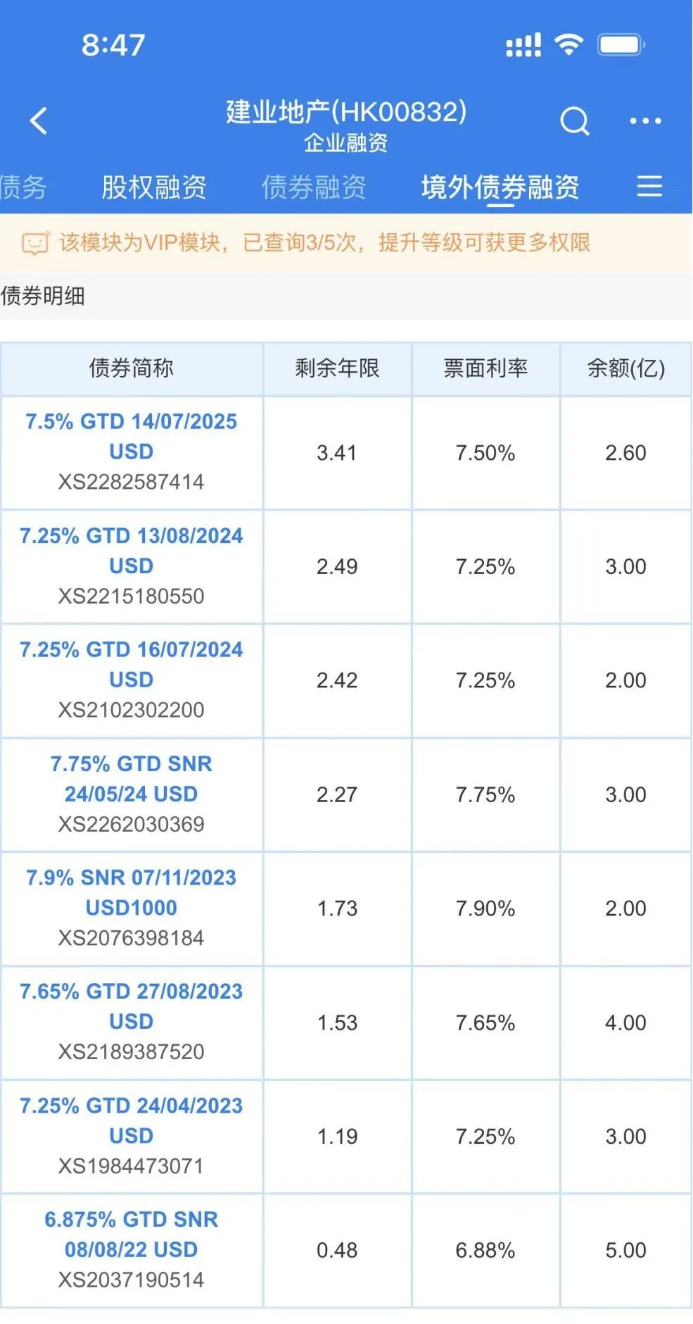企業預警通顯示,截至2022年2月15日,建業地產共有8只境外債券,總餘額為24.6億美元(約155.97億元)。