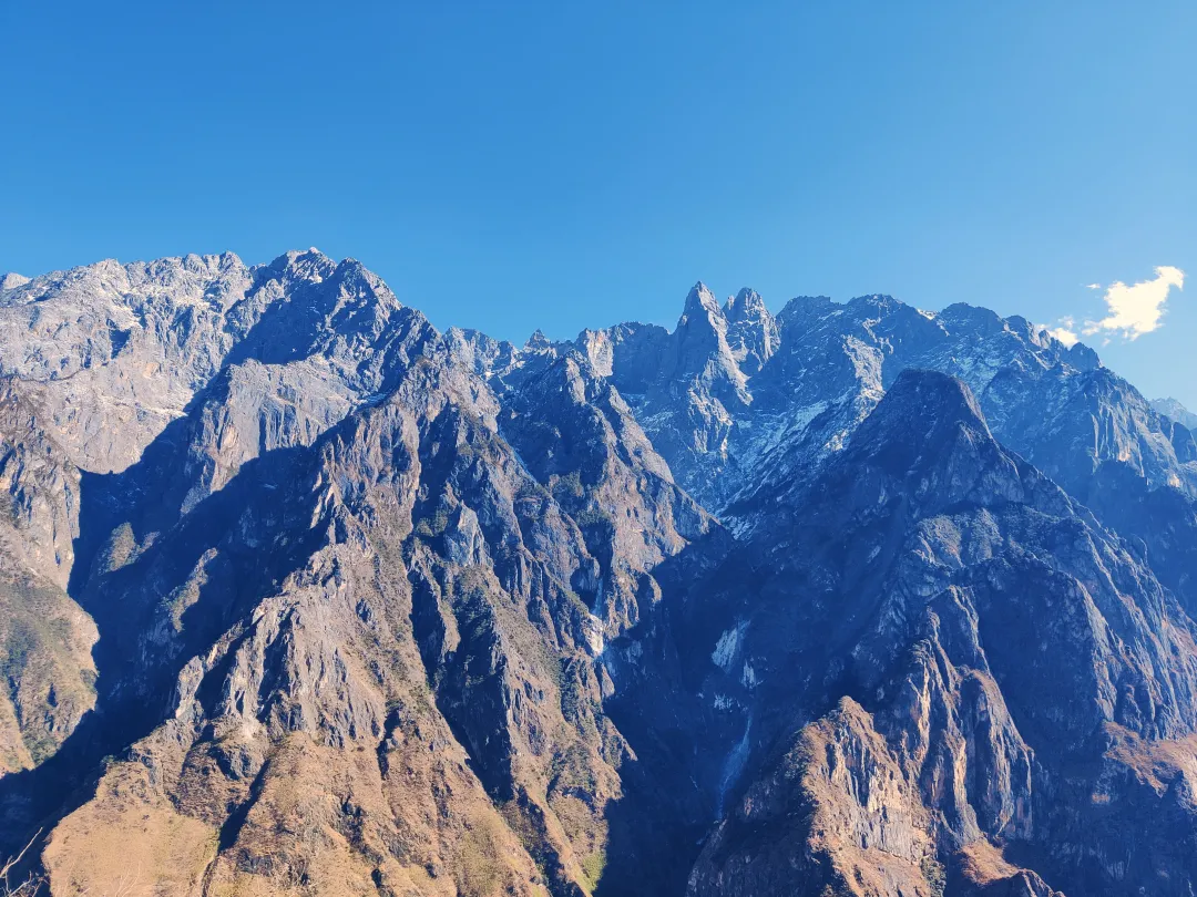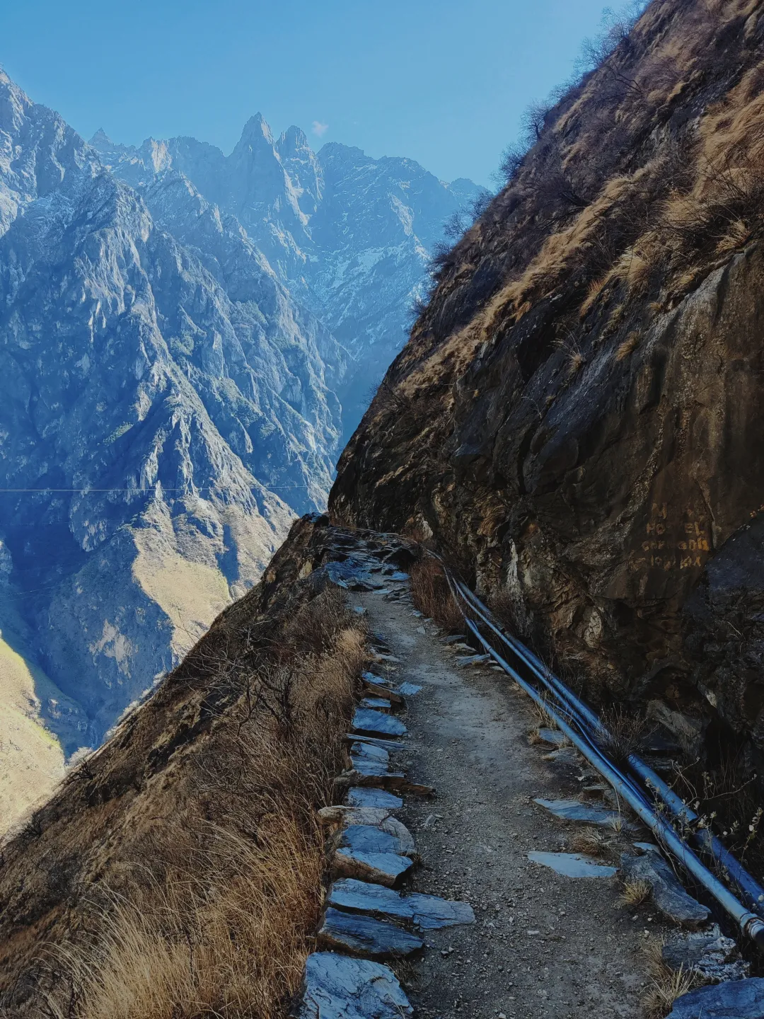 虎跳峽高路徒步,猶如天塹,或仰望雪山,或俯觀深谷。若論難度,算不上頂級,但若論壯觀,是其他徒步路線所無可比擬的,兩側雪山佇立,左邊哈巴雪山為伴,右側抬頭便是玉龍十三峰,夕陽西下,日照金山,蔚為壯觀,腳下是洶湧湍急的金沙江。行走在原始粗曠的峽谷之上,用汗水丈量腳下的每一步路。