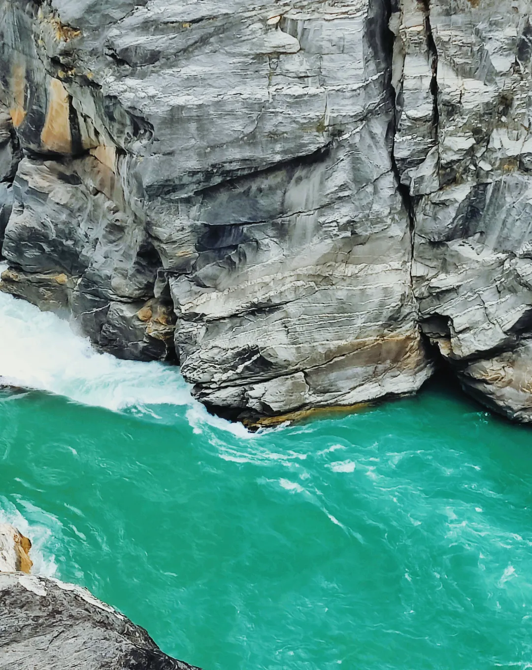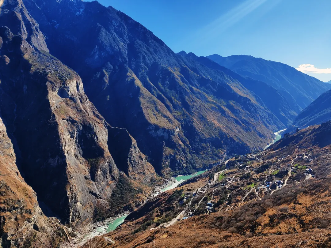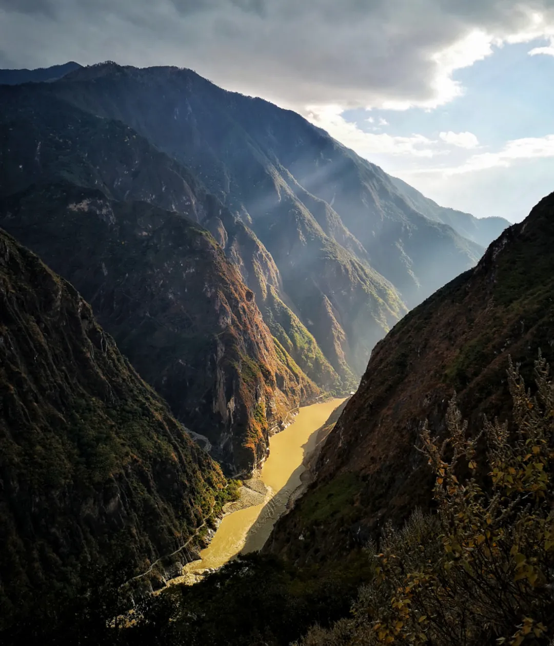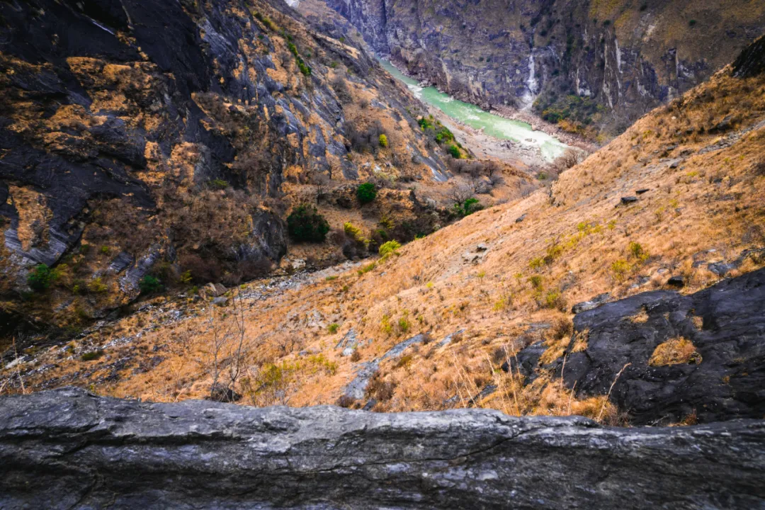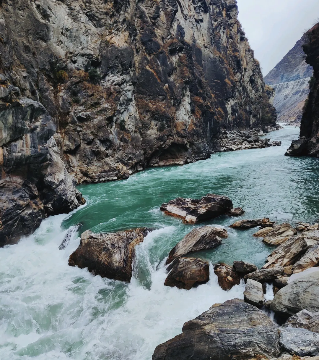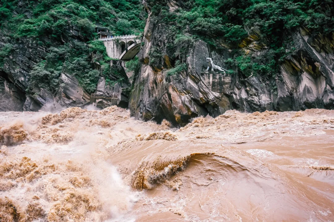 金沙江從青藏高原一路奔襲千里到此,突遇哈巴雪山、玉龍雪山兩大高山阻隔,河道瞬時變窄, 216 米的巨大落差使得原本平靜的江水瞬間變得“怒不可遏”,波濤洶湧、濤聲震天、無可阻擋。峽谷兩岸崖壁 90 度垂直於江面,平均落差三千多米,峽谷最窄處不足 30 米。