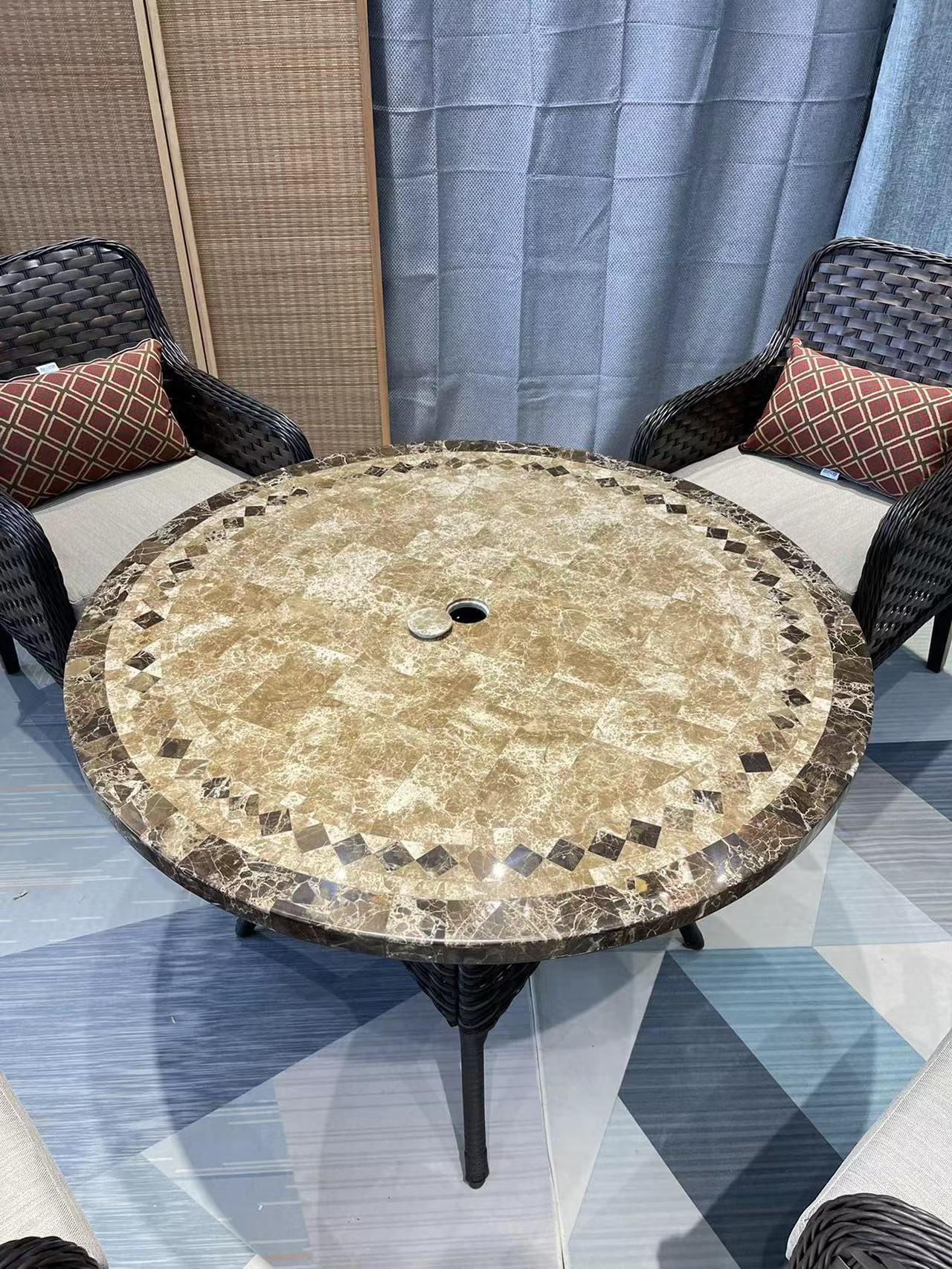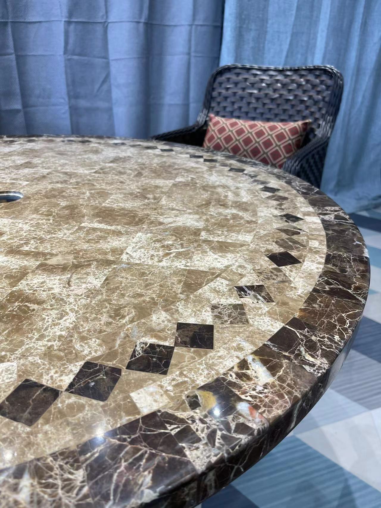非常豪華的一套美式產品,圓桌大理石拼花,中間帶傘孔,可以插中立傘
