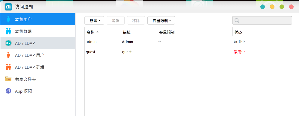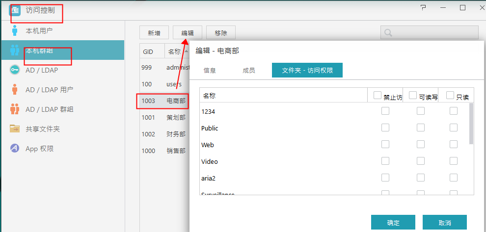 在訪問控制—本機使用者中,選中你要設定許可權的使用者,如“策劃部1號”,點選上方的編輯按鈕,轉到“資料夾-訪問許可權”,這裡可以設定某個使用者對於nas中的共享資料夾的許可權。