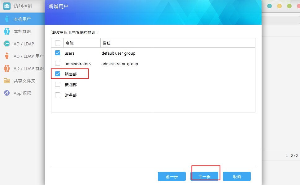 選擇此賬號所屬分組“銷售部”,(uers群主是所有使用者都必須勾選的),然後點選下一步。
