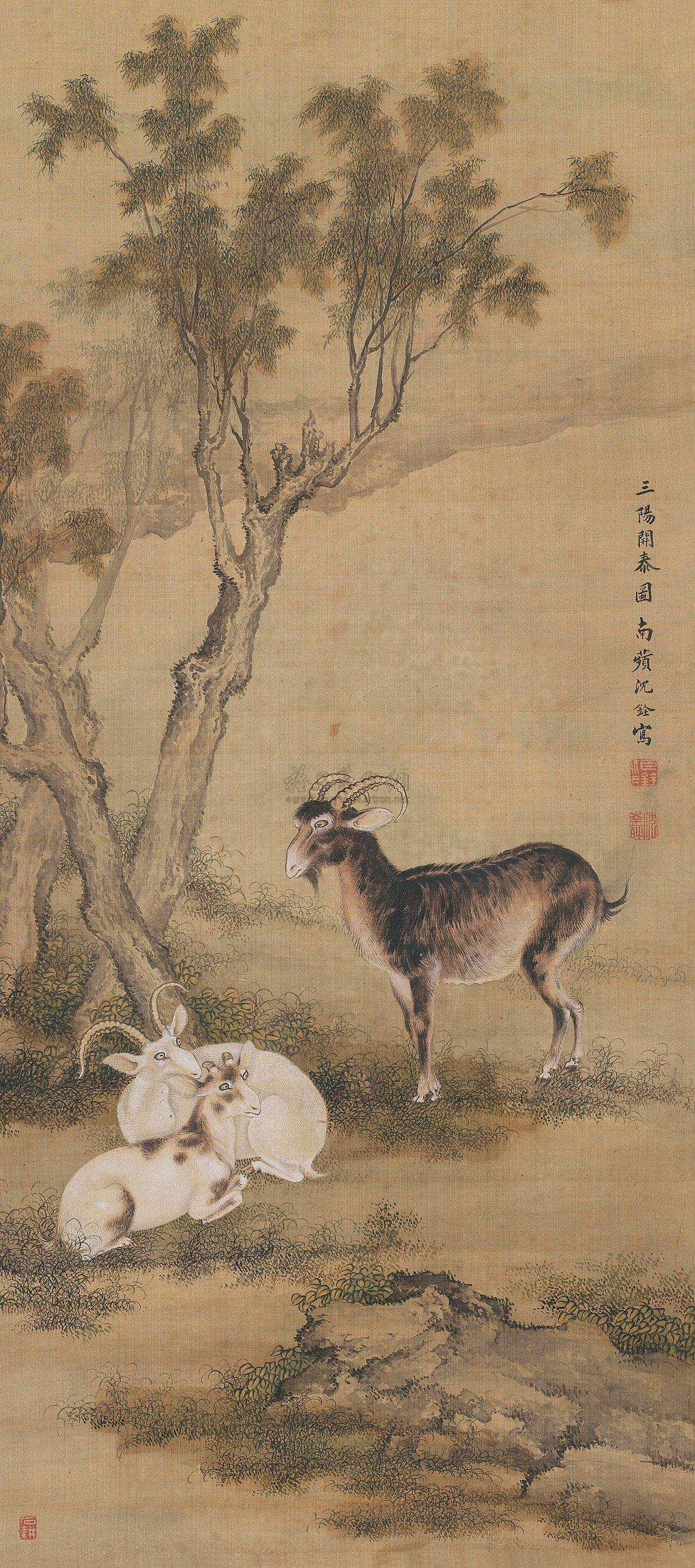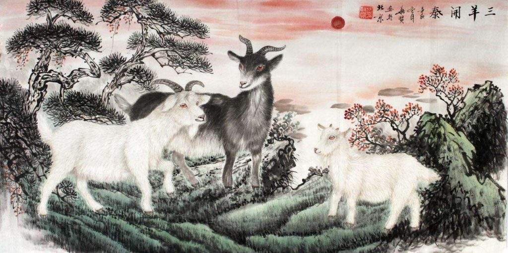 中國古代陽與羊同音,羊即為陽。“三陽”依照字面來析,解釋為三個太陽比較直觀,即早陽、正陽、晚陽。朝陽啟明,其臺光熒;正陽中天,其臺宣朗;夕陽輝照,其臺騰射,飽含勃勃生機之意。羊,在中國民俗中“吉祥”多被寫作“吉羊”。羊,儒雅溫和,溫柔多情,自古便為與中國先民朝夕相處之夥伴,深受人們喜愛。古代中國甲骨文中“美”字,即呈頭頂大角之羊形,是美好的象徵。