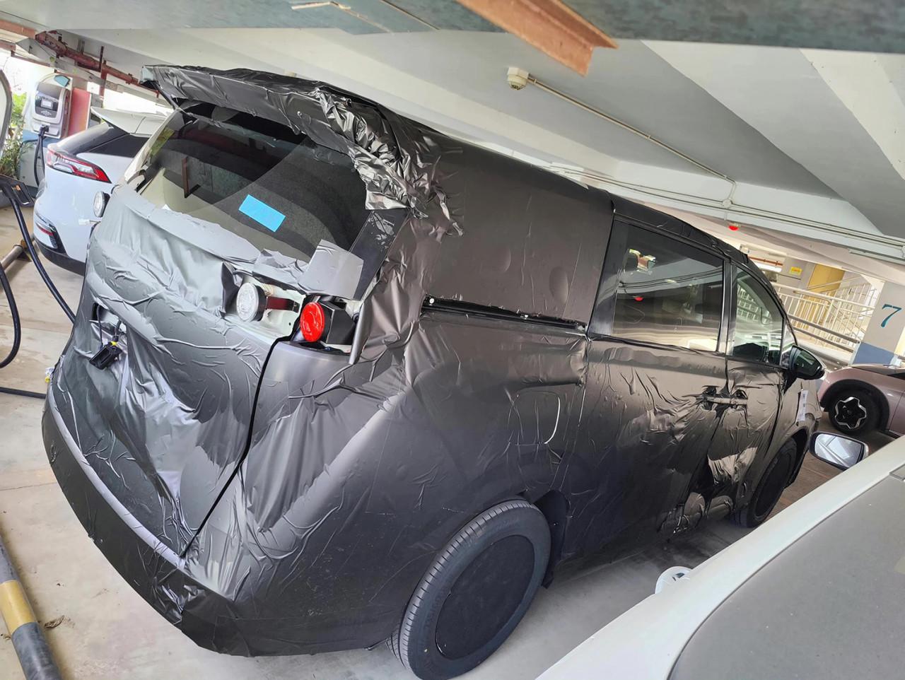 側滑門的滑軌是位於後側玻璃下沿的佈局,D柱不算很傾斜,是偏垂直的造型,車頂帶有很突出的尾翼,從尾燈輪廓來看,會是橫貫式的造型,整體位置很靠上,和後風擋銜接。後側翼子板和向尾部的過渡使用了很立體的造型轉折,很有力量感。