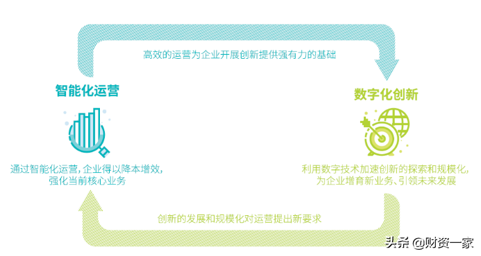 數字技術正持續而深入地驅動商業方方面面的變革,在撼動傳統競爭規則的同時,也孕育了新的增長機遇。智慧化運營能力和數字化創新能力的建設,為企業在數字轉型浪潮中全速前進提供了強勁的驅動力。智慧化運營能力幫助企業鞏固原有核心業務,為企業在核心業務上的優勢進一步奠定了基礎。此外,還為企業向新業務的過渡奠定了良好的基礎,加固核心業務帶來的業績提升也為新業務帶來了更大的投資空間。與此同時,新業務的拓展和規模化發展對企業運營能力的構建提出了更高的要求,而新業務帶來的績效回報將為企業的轉型和整體提升打下基礎。智慧化運營與數字化創新這兩大能力相輔相成,共同演進,推動企業實現業務的快速轉型。