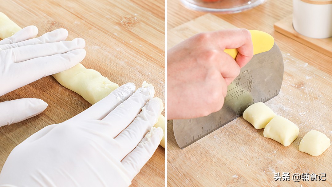 搓成長度為20釐米左右的長條,然後切成一段段2釐米左右的小塊。