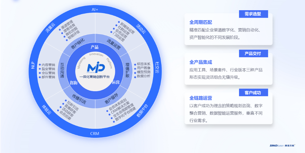 作為國內最早進入MarTech賽道的營銷服務商,賽諾貝斯基於16年營銷服務經驗,敏銳洞察到中國本土營銷市場環境下,企業需求與營銷服務之間的這一“斷層”,結合多年營銷服務經驗,形成“標準化SaaS+整合化的產品元件”的創新模式,推出MIP一體化營銷創新平臺,幫助企業解決各個階段的營銷難題。