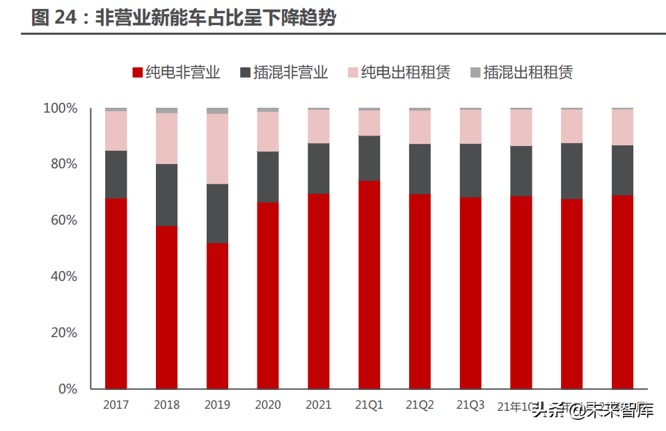 國內新能源車非營運市場佔比逐步提升,特別是 19 年以來,非營業車輛佔比 從 73%提升至 21 年的 88%,意味著行業進入產品驅動。