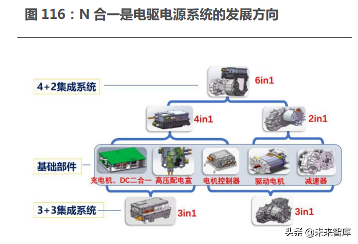 物理結構上,N 合一是發展趨勢,將減少重量和體積。系統在由小功率到大功 率,由中低壓到高壓,從電機、電機控制器單體到系統整合快速迭代。以電驅系統 為例,2017 年以前,基本是分體的部件為主,個別外企出現二合一、三合一方案, 2019 年後,大三合一已經開始大量量產,2021 年 1-10 月整合式電驅動系統佔比 超過 75%。