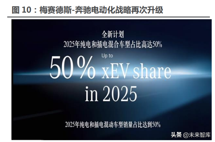 電動化戰略:賓士目標在 2022 年為所有細分市場提供純電車型,2025 年純 電動和插電混動車型銷量佔比達到 50%,計劃 2030 年只銷售純電動車型。