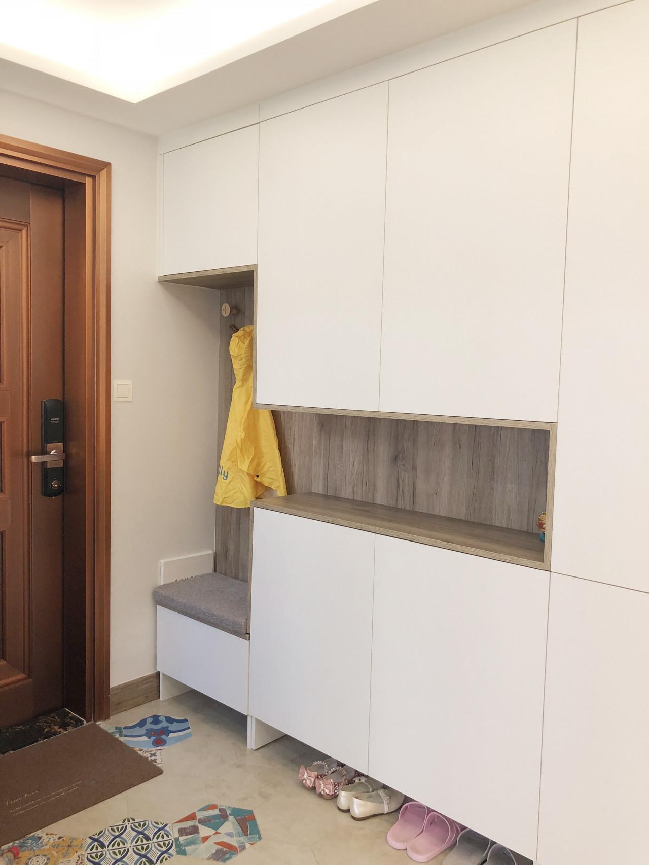 門廊通常設計為頂部定製鞋櫃,這樣頂部空間可以用來放置一些不常穿的鞋子或其他物品。鞋櫃的中間是空的,可以用來放鑰匙或包,所以設計比較實用。鞋櫃底部預留15釐米的高度,用於放置經常更換的鞋子。